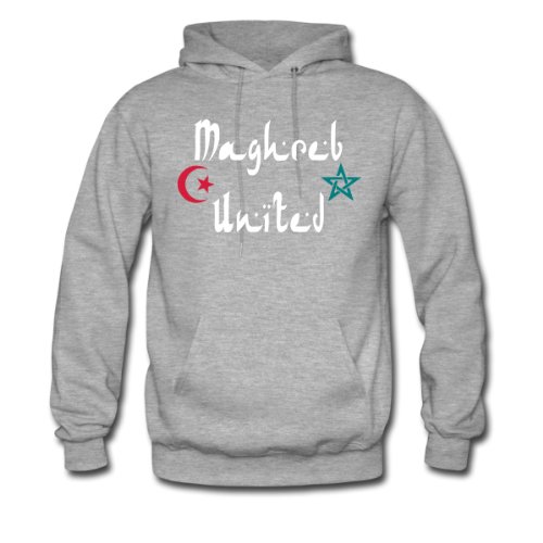 #Sweat homme Maghreb United maroc tunisie algerie. Ce pull molletonné et chaud possède une capuche à double épaisseur, des cordons de la même couleur, ainsi qu'une poche kangourou devant. L'intérieur molletonné procure un confort absolu. Ce pull possède une coupe droite, assez près du corps, avec des coutures robustes aux poignets, à la base et aux extrémités de la poche kangourou. Grâce à un grammage de 320g/m² et à une teneur en polyester, le pull conserve sa forme dans toutes les situations, même après plusieurs lavages. Composition 80% coton et 20% polyester. Après confirmation de commande nous imprimons le produit individuellement pour toi. Ainsi, nous fabriquons des pièces uniques qui font vraiment plaisir à nos clients et soit dit en passant, nous préservons l''environnement.