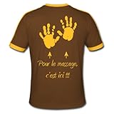 Spreadshirt, Par ici le massage !!!, Tee shirt Retro Homme, chocolat/soleil, MMême les hommes ont le droit à un bon massage !!. Ce tee shirt style retro a deux bandes de couleurs contrastées sur les épaules, au col et aux ourlets de manches. Il est 100% coton et d'une très grande qualité, grâce à ses coutures doubles aux manches et à l'encolure. L'épaisseur du tissu le rend résistant à l'épreuve du temps: 180g/m². 100% coton. Après confirmation de commande nous imprimons le produit individuellement pour toi. Ainsi, nous fabriquons des pièces uniques qui font vraiment plaisir à nos clients et soit dit en passant, nous préservons l''environnement.